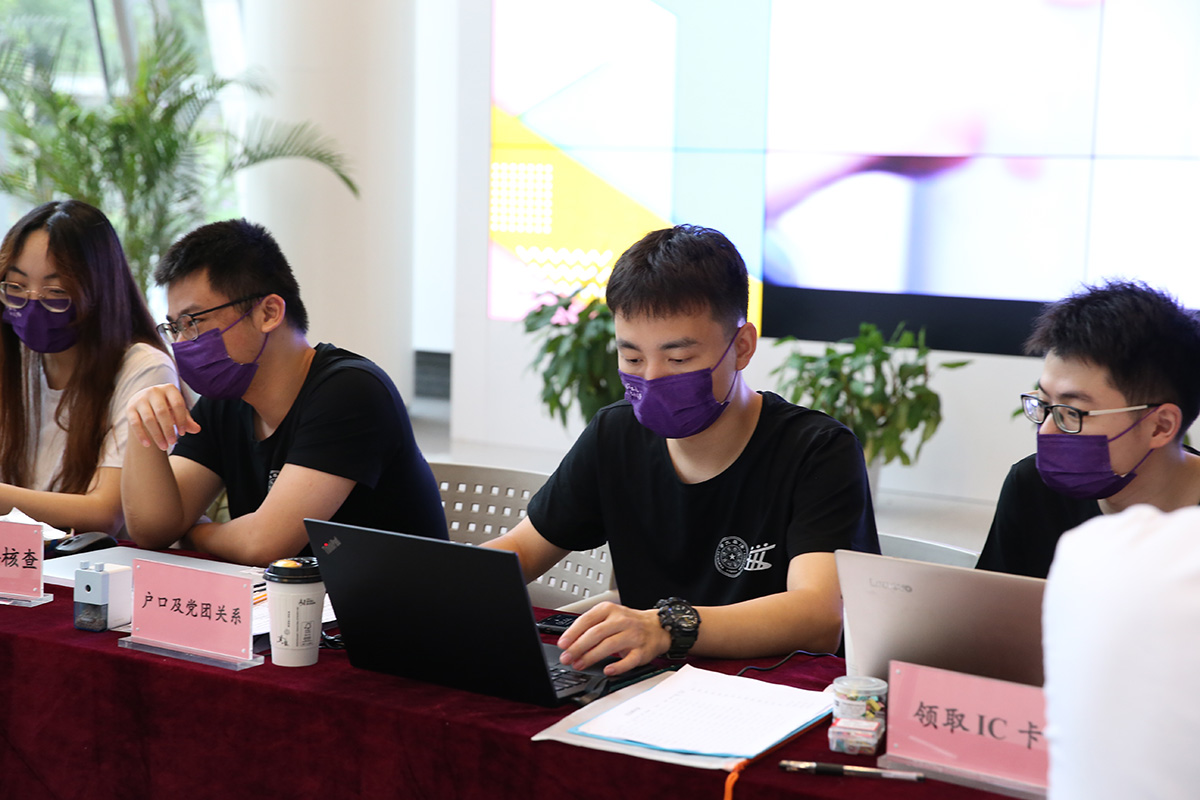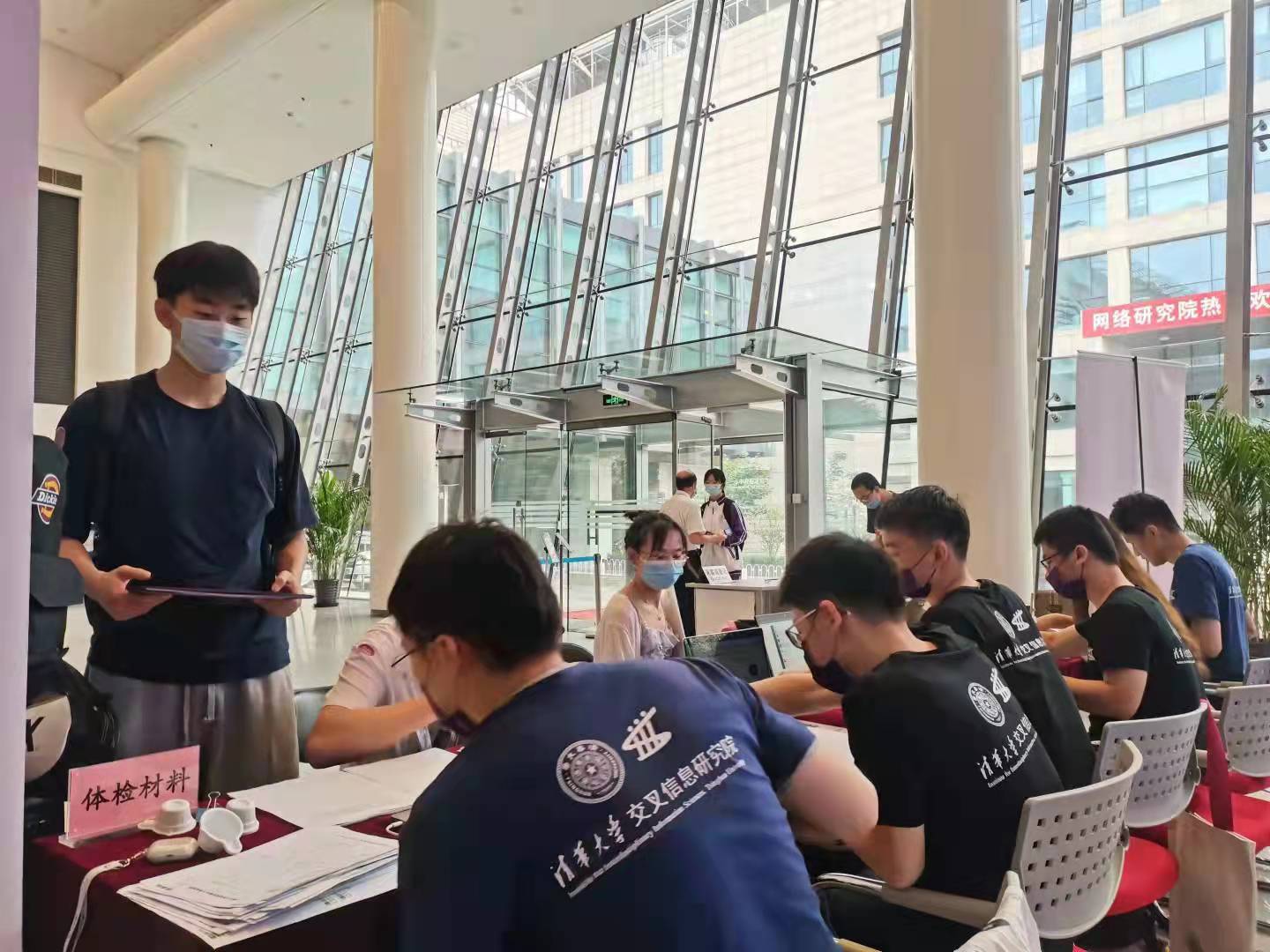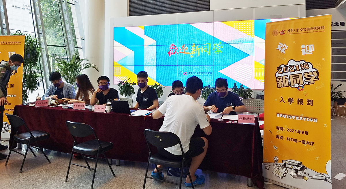 交叉信息院迎新点设在FIT楼一层大厅。为方便新同学办理入学手续,研究生教务老师和志愿者们设立了“一站式迎新点”,从材料审核、入学登记到党组织关系转移,再到细致详实的新生手册,一点一滴都承载着对新生的细心关怀。