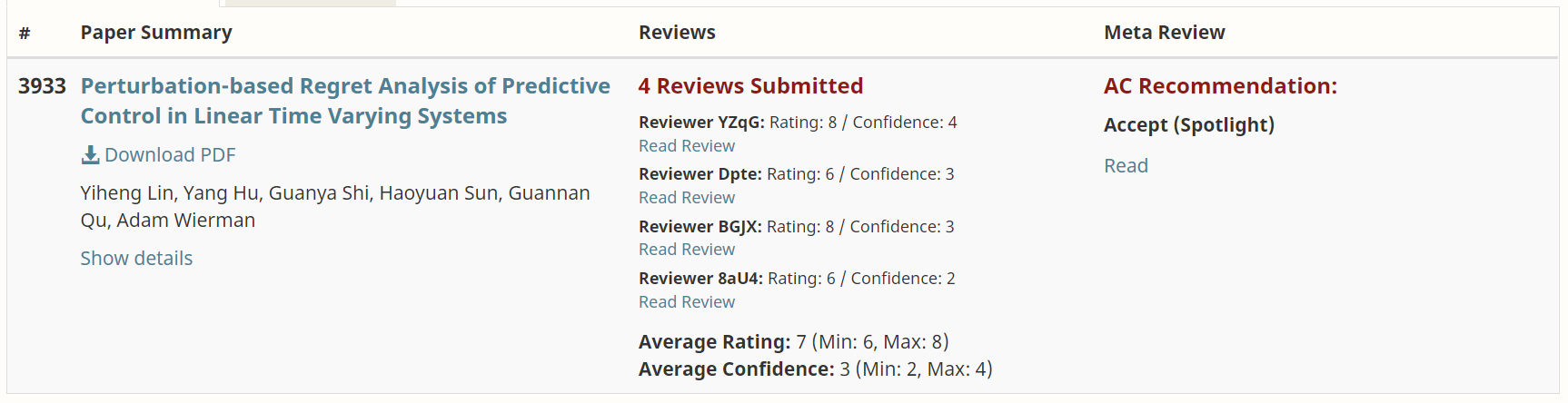 2020届姚班校友林一衡、2018级在校生胡扬作为共同第一作者完成的论文Perturbation-based Regret Analysis of Predictive Control in Linear Time Varying Systems近日被第三十五届神经信息处理系统大会(35th Conference on Neural Information Processing Systems,NeurIPS 2021)接收并评为焦点论文(Spotlight paper),本年度大会上获得该荣誉的论文占总投稿数的比例不到3%。该文旨在研究模型预测控制在一般的线性时变系统中性能的理论保证。