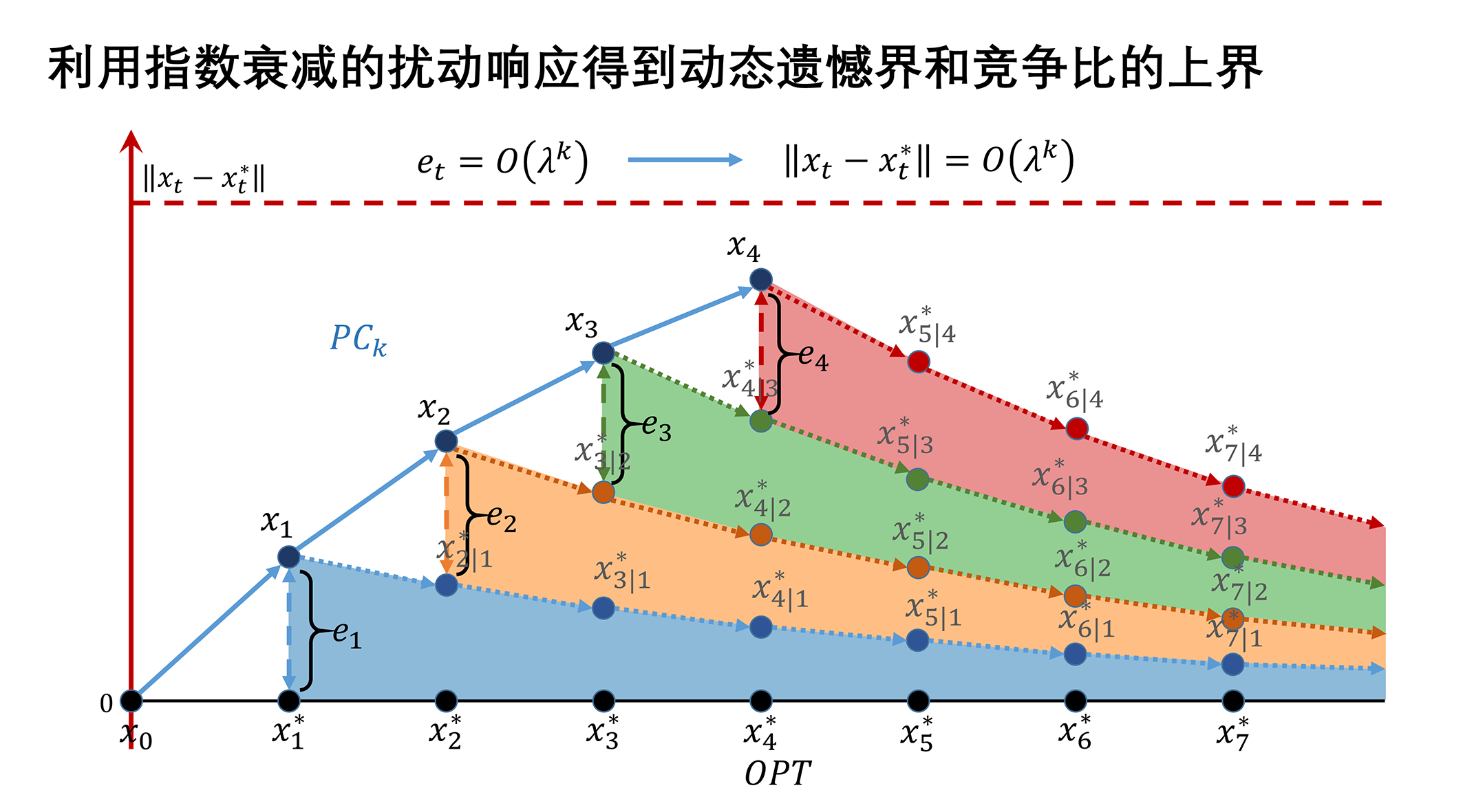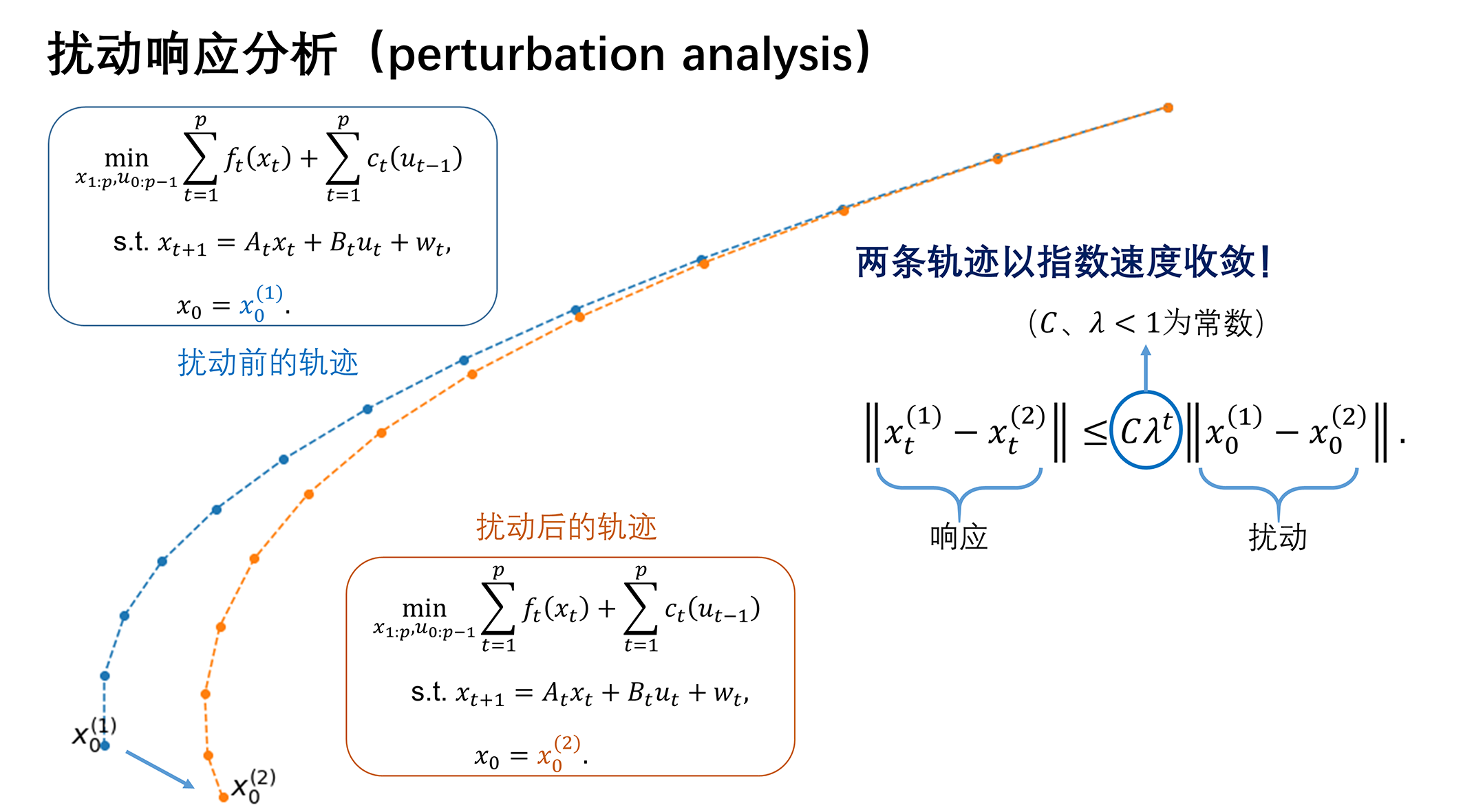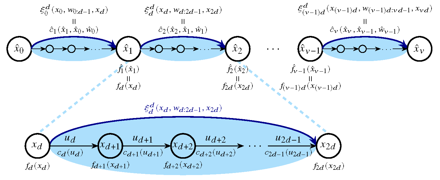 此外,在研究系统对参数扰动的响应时,提出了一种新的从控制问题规约到在线优化问题的方式。该研究的规约方法主要利用了下述事实:如果一个控制系统的可控指数(controllability index)为d,则总可以通过恰当的控制输入,使系统在d步后达到状态空间内的任意状态。这样一来,可以将d步视为一个整体,在轨迹上每d步插入一个决策点,使得决策点之间相互独立,从而将控制问题转化为无约束的在线光滑凸优化(SOCO)问题。