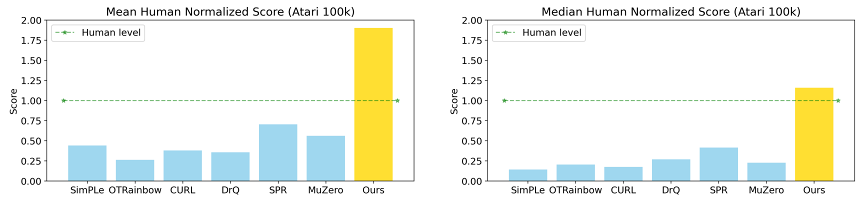 高阳研究组在强化学习领域中取得突破,研究组所提出的模型EfficientZero首次在雅达利(Atari )游戏数据上超过同等游戏时长的人类平均水平。EfficientZero的高效率学习能力为强化学习算法应用到现实世界场景提供了更大可能。