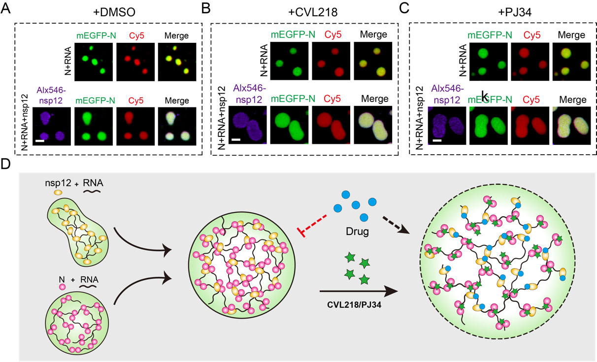 图2. CVL218和PJ34干预N蛋白相分离的作用示意图