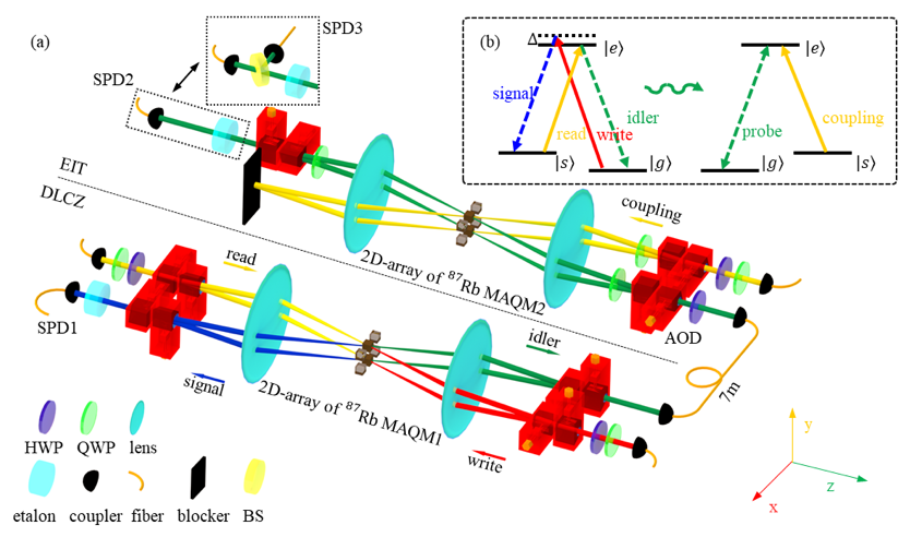 多路复用原子存储器间的量子通信实验装置示意图