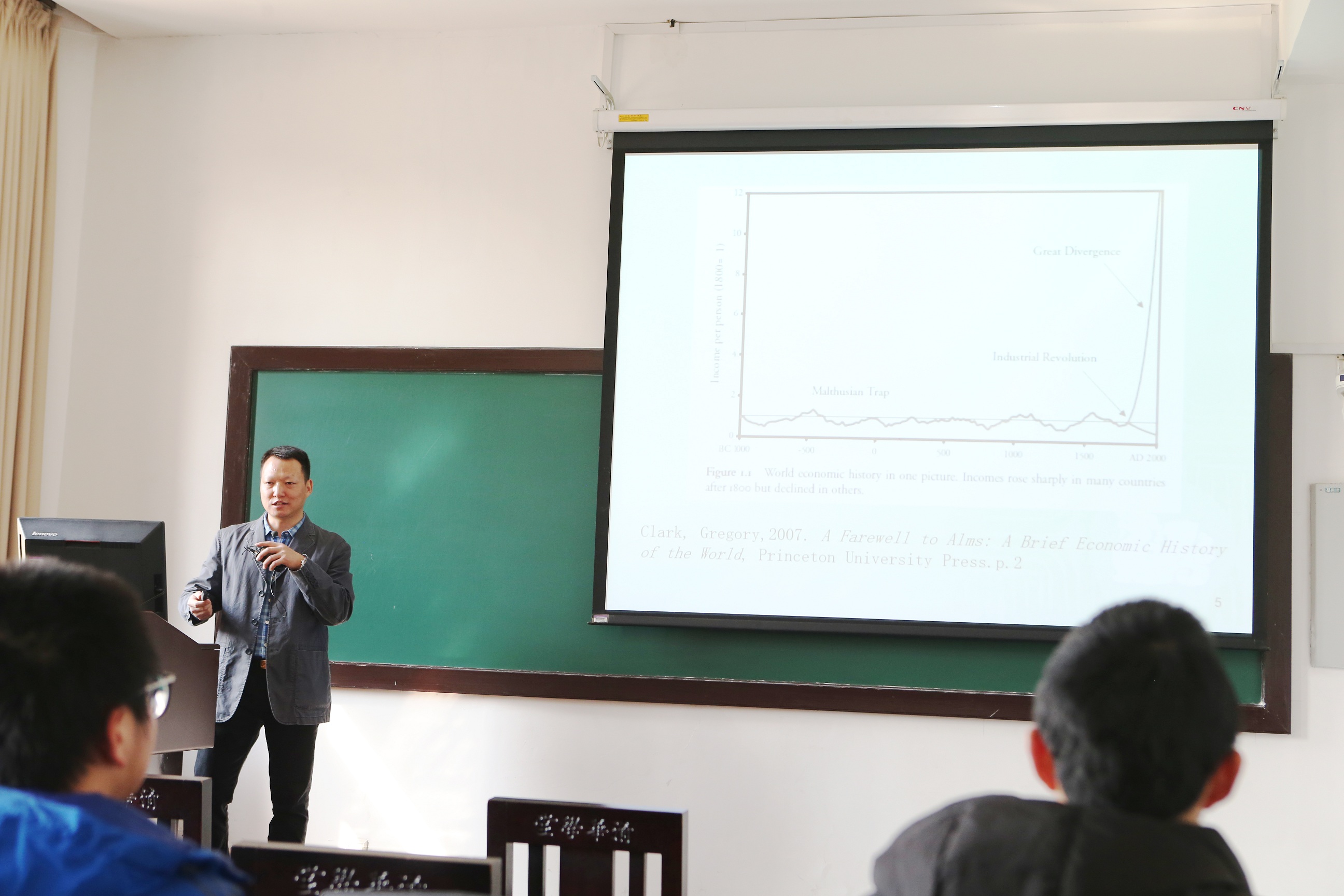 刘剑雄博士带领同学们分析世界体系中大国崛起的历史规律,共同认识学习创新在大国崛起中的关键作用。同时,在历史视角分析的基础上,刘剑雄博士结合中国历史上的经济成就、科学革命、技术革命和工业革命、数字经济的理论逻辑以及中国的赶超战略,从文化、自然资源、环境、需求、人口政策等多个层面展开分析。他指出,当前的中国的经济尚有很大的发展空间,需要从现有的产业内开展技术创新,可通过提高劳动生产率、发明新技术等手段加速发展进程,并借鉴发达国家的技术优势和成功经验,以降低技术创新和产业升级的成本与风险,赢得后发优势。这一结论也引发在座的同学们对个人和国家命运的深刻思索和探讨。