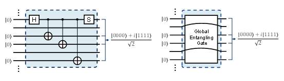 图 1 全局纠缠门可以有效的对量子线路进行化简。图中示例为作用在选定四个量子比特上的全局纠缠门。为了制备四量子比特最大纠缠态,传统量子电路一般需要至少三步双量子比特纠缠门。使用全局纠缠门则仅需一步即可实现所有量子比特的最大纠缠。