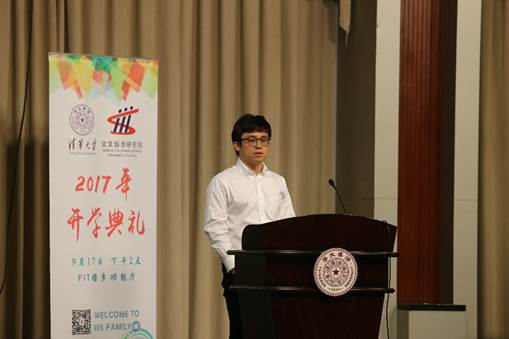 交叉信息院唐平中助理教授代表全体教师对新同学的到来表示欢迎。唐老师在发言中例举交叉信息院本科生和研究生在学界和业界所赢得的卓越口碑,勉励所有新生志存高远,充分利用姚班和院内的资源及影响力,奋力攀登“世界上最优秀计算机毕业生”的高峰,做清华的旗帜,做中国的旗帜。