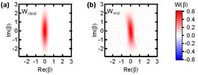 图2: 截断相位态(Truncated phase state)的制备。(a)左侧是理想的Wigner函数,右侧是实验测量出的Wigner函数,其保真度达到97%。(b)根据所测Wigner函数重构出的密度矩阵。这种量子态在量子随机行走方面有重要应用。