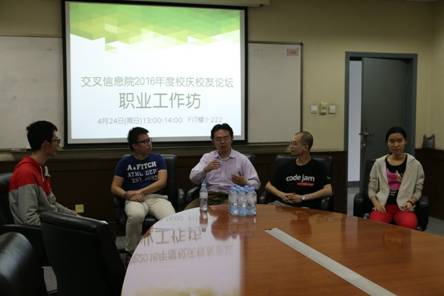 4月24日下午,继邹昊博士特邀报告后,交叉信息院2016年校庆校友论坛之“学界分论坛”和“职业工作坊”活动分别在FIT楼多功能厅及1-222会议室顺利召开。
