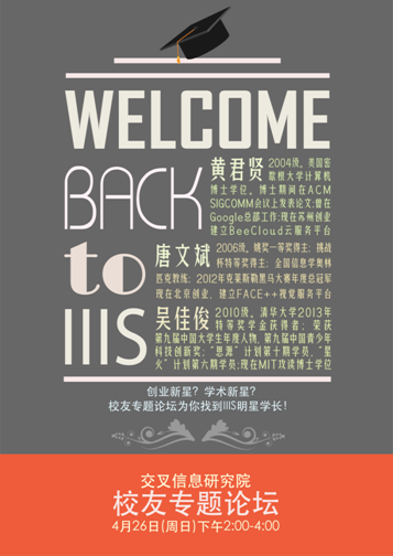 迎来了第104个生日,交叉信息院2015年校友专题论坛在FIT楼1-222顺利召开,2004级黄君贤、2006级唐文斌、2010级吴佳俊等三位毕业院友受邀担任论坛嘉宾,与在校师生分享毕业后的成长历程。交叉信息院姚班本科生、研究生和部分教师共计40余人共同参加此次论坛活动。专题论坛由计科10班殷和政主持。