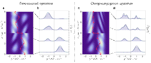 图2:动量空间中的Majorana动力学演化过程中的时间反演和电荷共轭。该粒子的时间演化是由Majorana方程决定的,对称操作发生在演化的中点t=4。 a,b. 在时间反演操作之后,Majorana粒子的动量和速度同时反号。 c,d. 从定义上说,粒子和相应的反粒子具有相反的动量,但它们的速度却是一样的。因此,在电荷共轭操作之后,只有动量反号,而Majorana粒子的速度保持不变。