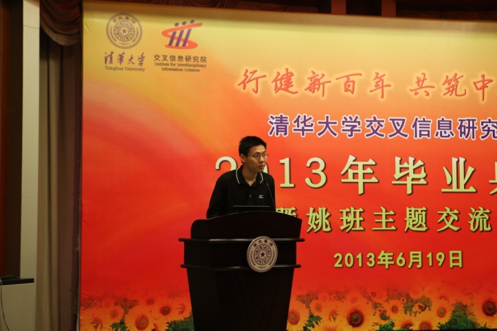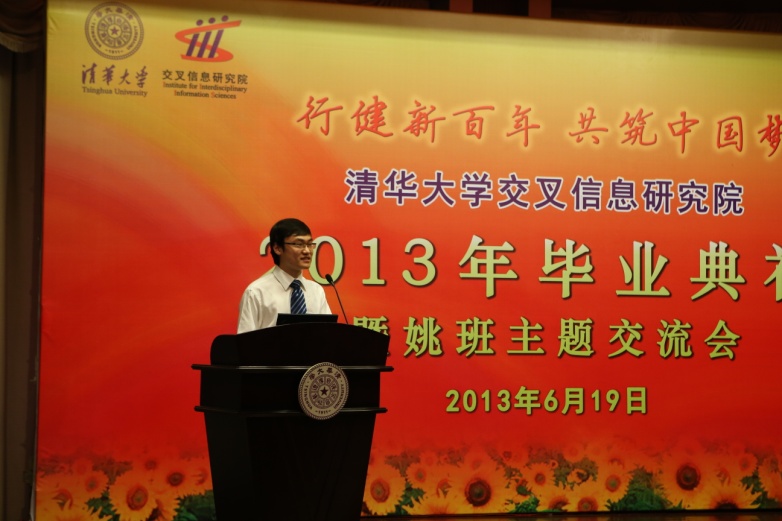 年度“姚奖学金”一等奖获得者吴佳俊、本科生代表贾永政和研究生代表吴辰晔分别进行了风采展示。吴佳俊同学以他自己和身边同学的学习经历出发,对姚班的“国际化师资”、“因材施教”的培养特色和丰富的科研资源表达了最直观的感受;贾永政同学以姚班团总支为主要依托,介绍了我院学生干部队伍的发展并展示了2012至2013学年内开展的富有特色的学生工作;吴辰晔同学则是在讲述博士生涯中的点滴趣事过程中,娓娓道出了他对交叉信息院和导师姚先生的感谢与不舍。
