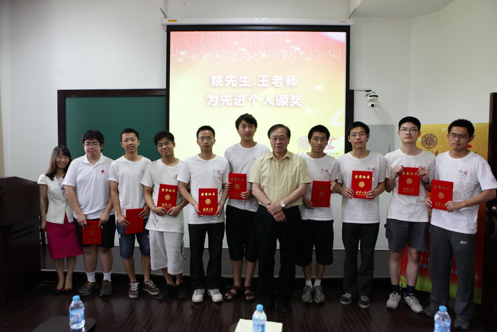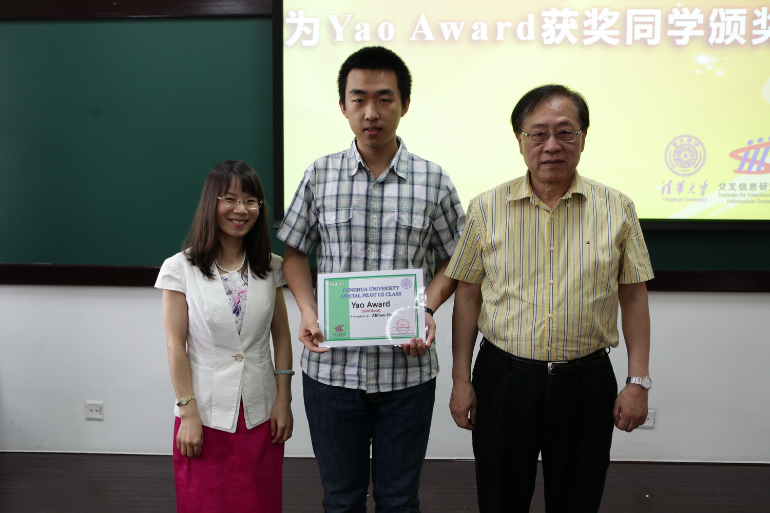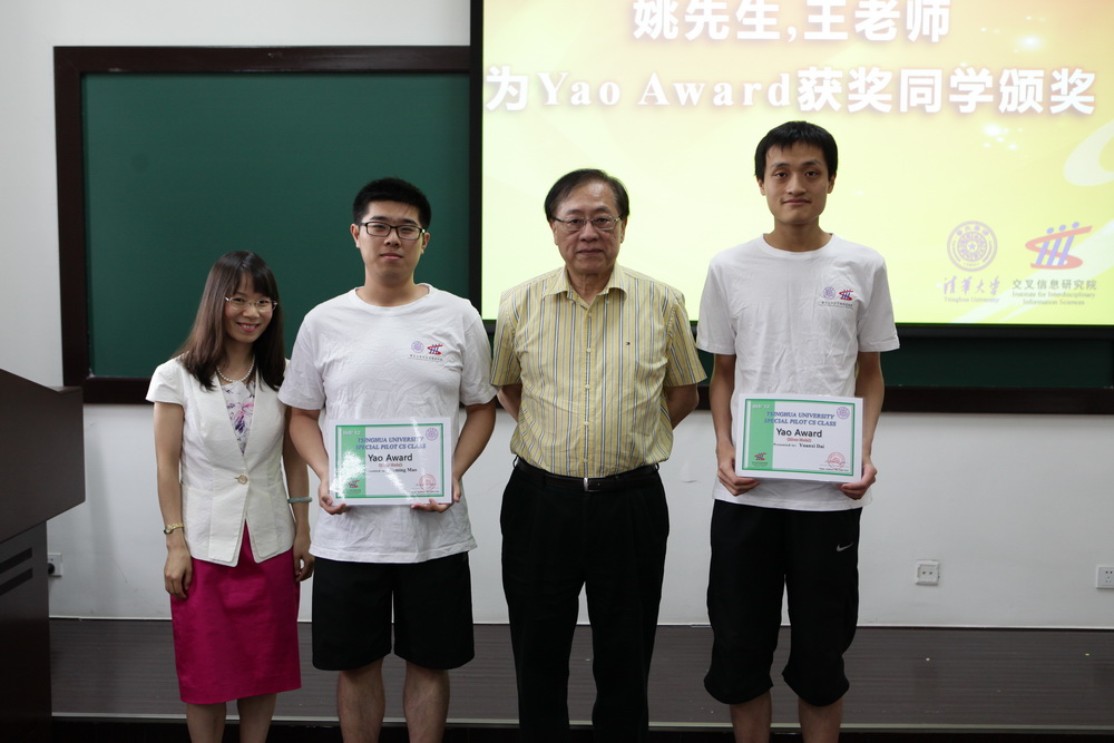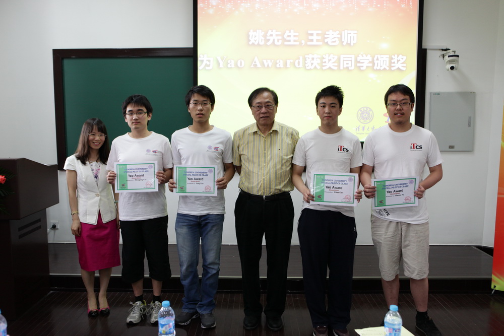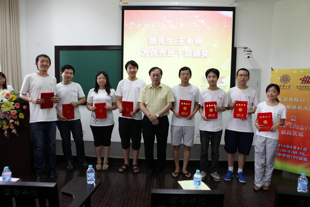 5月31日下午,姚班2012年春季学期大班会暨Yao Award奖学金颁奖仪式在清华学堂102室召开。姚班首席教授姚期智院士,姚班项目主任王跃宣教授,姚班班主任王永才、张松海、陈震,姚班辅导员陶浩雄、顾钊铨,全体姚班同学及部分研究生代表参加大班会活动。王跃宣教授主持大班会。