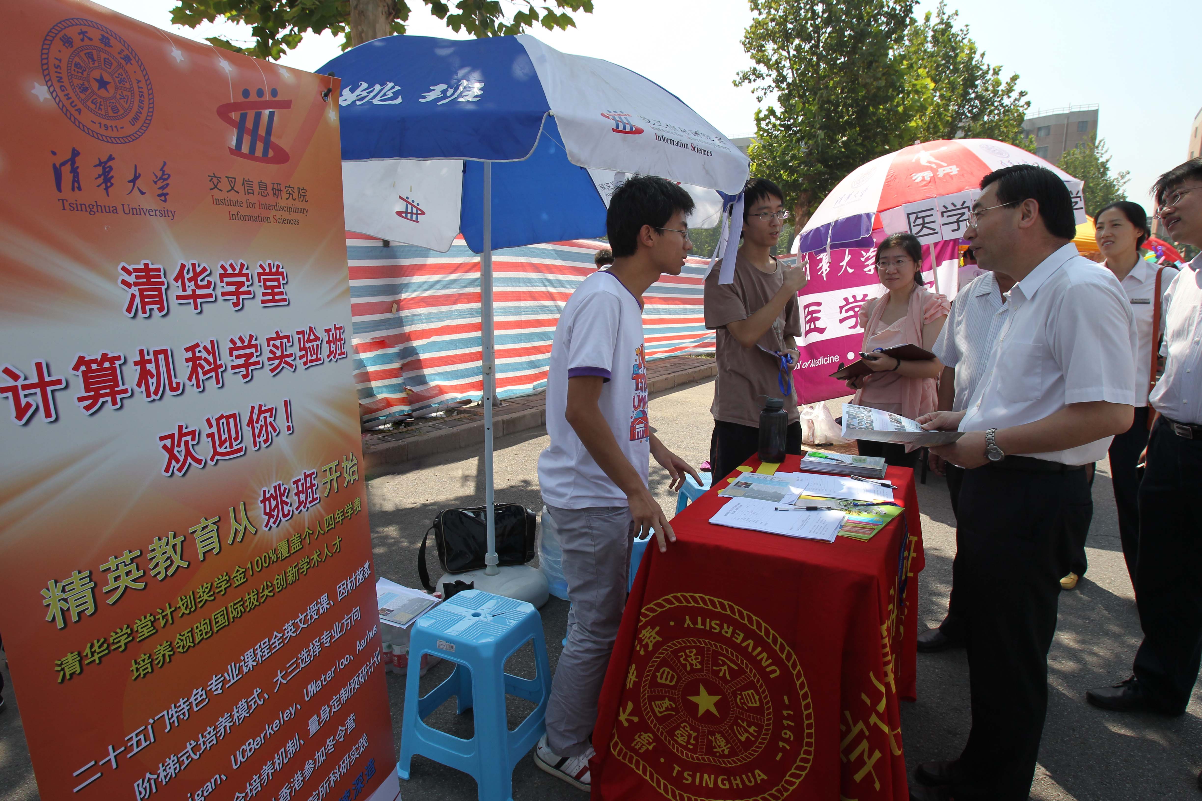 在8月15日一早,交叉信息院已录取新生报到暨2012年姚班二次招生工作即拉开了序幕,新同学们怀着饱满的热情踏入了清华园的大门。上午10点,校长陈吉宁和校党委书记胡和平等校领导亲赴新生入学报到地点,看望前来报到的新生和家长们,并慰问参与迎新工作的师生员工。在综合体育馆西侧网球场,陈吉宁校长亲切向新同学询问报到情况和体育锻炼情况,当得知我院2012级的张天翼等许多同学都是独自来到学校报到,陈校长非常高兴,他鼓励同学们要继续培养独立生活的能力,进而培养独立思考的人格。在紫荆学生公寓区,胡和平书记来到我院姚班二次招生分报名点询问招生和迎新情况,翻阅姚班招生宣传材料,并和学生志愿者亲切交谈。