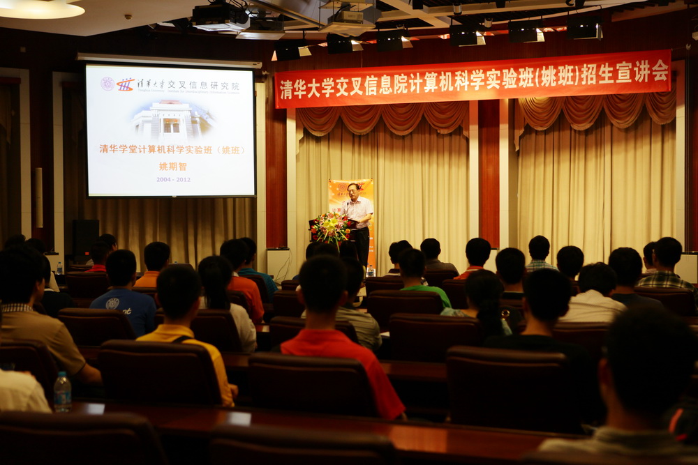 当晚,姚班二次招生迎来了报名高峰,二招宣讲会在信息技术大楼多功能厅召开,共计近150名清华新生提交了报名表。姚期智院士在宣讲会上阐述了姚班的办学目标,特别指出要为清华的优秀年轻学子提供一个得到世界最一流教育的机会,他鼓励新生踊跃尝试,争取有机会在姚班发现自己的兴趣所在和能力所长,成为建设中国、建设世界的未来主人。姚班项目主任王跃宣教授详细介绍了姚班的办学特色、人才培养成果及国际声誉,她强调计算机科学研究的是计算机的“根”的问题,希望大家积极报名进入姚班实现理想和梦想。交叉信息院副教授Kihwan Kim、助理教授Iddo Tzameret、李建和华强胜等也结合各自的研究兴趣及所开设课程做了宣讲报告,并与新生展开互动,答疑解惑。