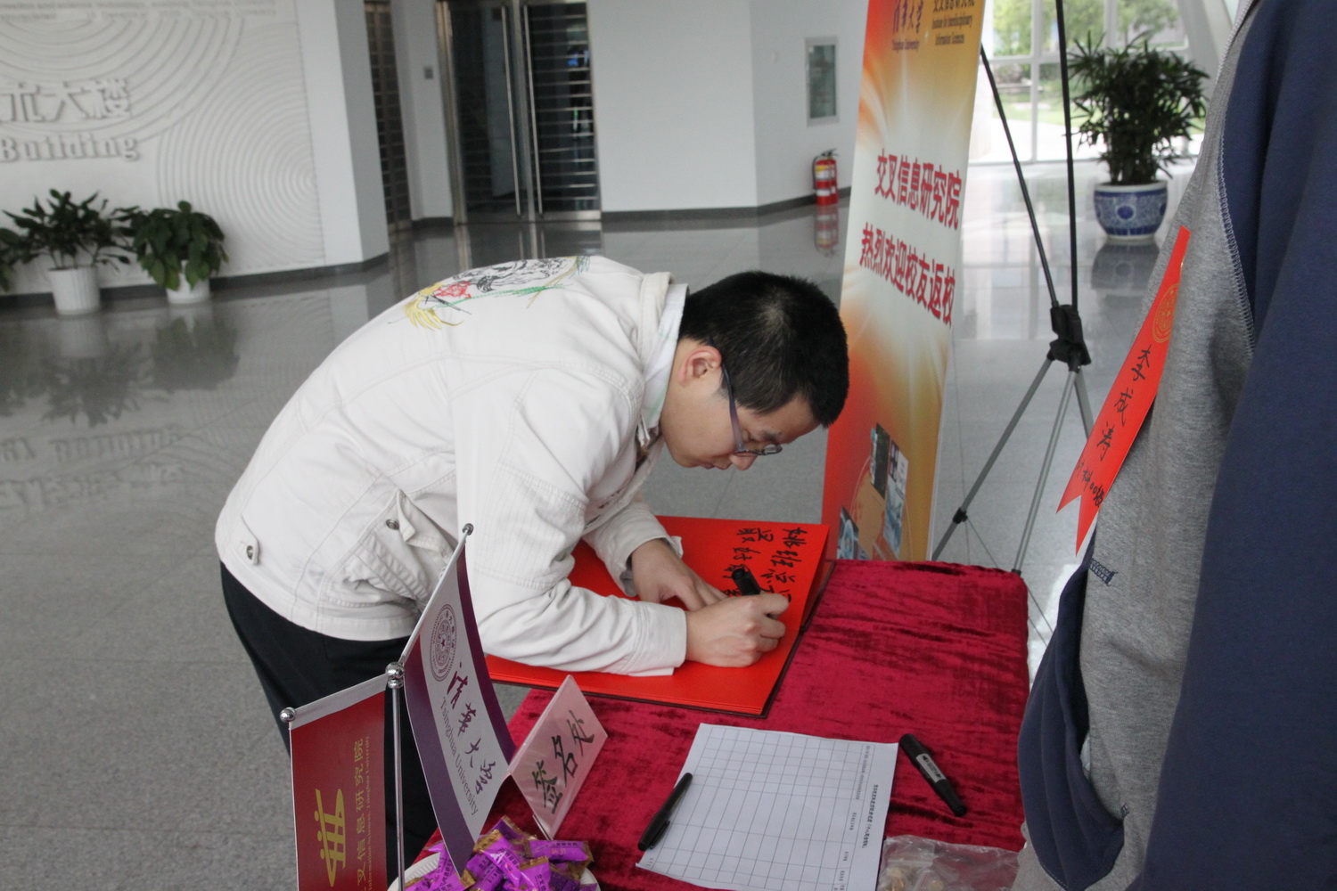 上午9点,校友们陆续回到母校,纷纷来到FIT一层大厅迎宾台,佩戴校友名签、更新个人信息、了解校庆相关活动安排、并在礼宾部上写下对母校和我院的寄语。计科50班毕业生、现在计算机系读研、将要远赴重庆选调的罗森同学写下“姚班总是最好的”,计科50班毕业生叶阳写下“为姚班的荣耀而奋斗”等感人寄语。