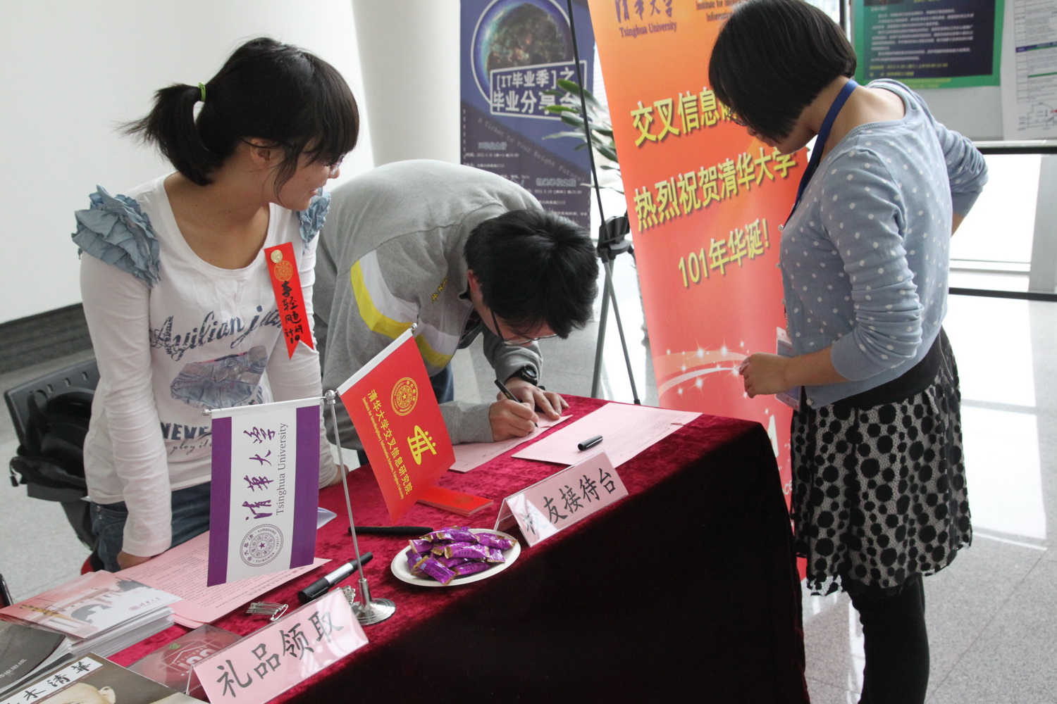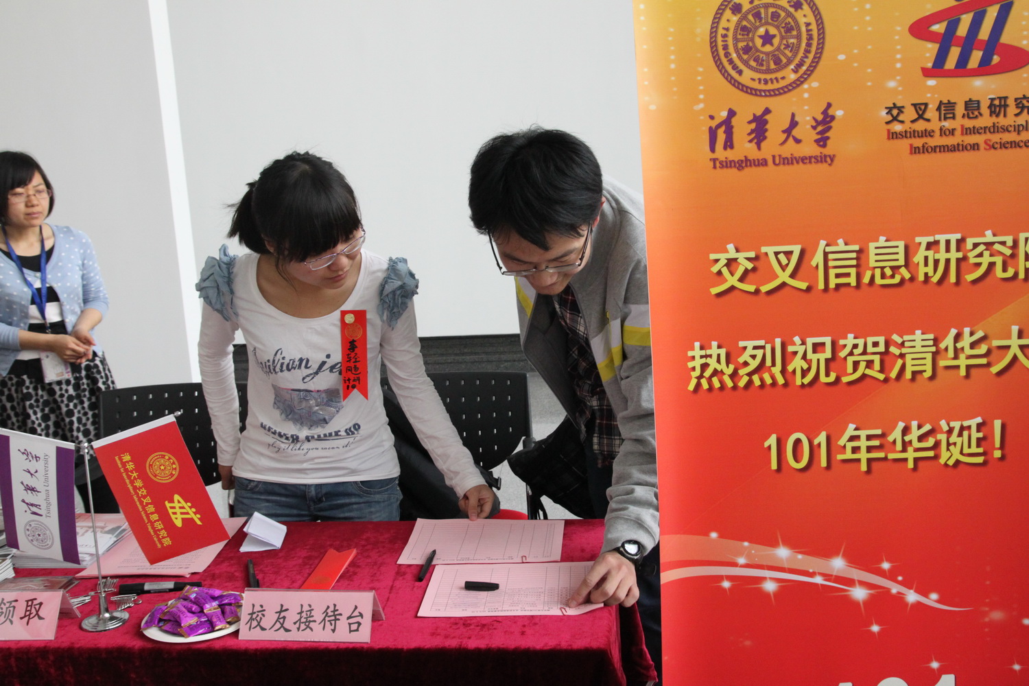 迎来她一百零一岁生日,校园内外欢欣鼓舞,交叉信息院在FIT大楼一层大厅设迎宾台,热情欢迎校友返校,师生校友共庆母校生日。