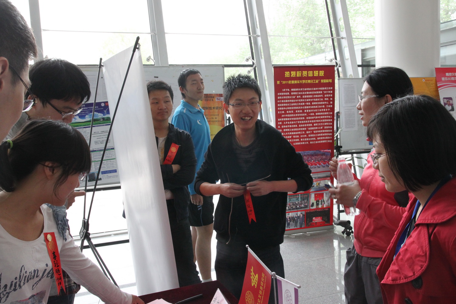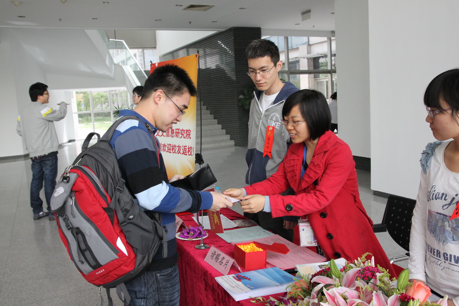 清晨8点半,我院校友接待志愿者计科10班的李轻飏和计科00班的李成涛就来到FIT大楼,将校庆活动资料、清华人刊物、我院致校友们的一封信、我院宣传资料、纪念品等物资整齐地摆放在一层大厅迎宾台上,迎宾台彩旗飘扬,鲜花簇拥,给人以温馨、欢跃的感觉。