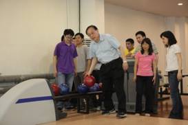 晚上八点半到达房山诚通颐年山庄时,天色已然全黑,但大伙的兴致正高,入住完毕,就相约奔向娱乐室。山庄坐落在房山区石花洞景区内,据说原为军工企业的大院,废弃的汽车生产车间被改造成多功能的综合文体活动中心,集保龄球、沙狐球、台球、羽毛球、迷你高尔夫球等多种娱乐项目于一体。球场上的师生,放下平日里的拘谨,玩到了一起。只有在这样完全放松的时候,你才会发现,原来身边隐藏着各方面的高手,不仅仅是学术攻关方面的能人,玩起各项文体活动来也毫不逊色。尤其姚先生更是深藏不露,出入保龄球馆、台球室,信手拈起,样样能镇得住人,令师生们大开眼界。