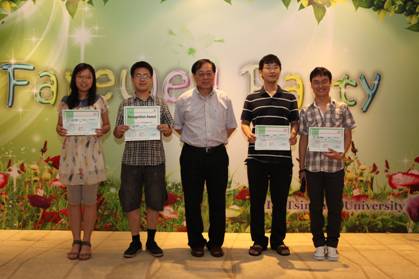 本年度的科研成就奖(Achievement Award)、突出贡献奖(Contribution Award)和优胜奖(Recognition Award)。2008级博士生唐邦晟荣获“2011科研成就奖”;郑波、王冠宇、祖充等人获得“2011突出贡献奖”;吴辰晔、吴成钢、杨光、郝霄虹等人获得“2011优胜奖”。姚先生亲自为获奖者颁发奖状和奖学金。