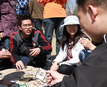 品尝了朴实的农家豆腐宴之后,下午继续向昌平蟒山挺进。从通天门一路上行,十二生肖和弥勒大佛坐山相迎,一片祥和喜庆。六十余人的大队伍在山脚下分散自由行动,打升级、斗地主、三国杀,花样频出,不亦乐乎。长廊上的一队人马,倚着地形的便利,面对面玩起了杀人游戏。察言观色、分析推断、口才较量、心理大战,妙趣横生的面杀过程让跨年级的师生之间迅速突破隔阂熟络起来。爬山的一队人马也自有乐趣,在有限的时间内挑战高度极限,着实紧张刺激。