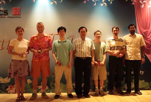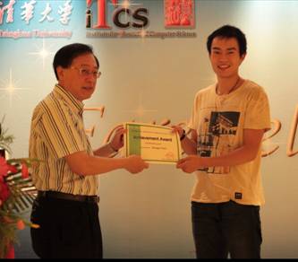 晚宴的一个重要环节是颁发ITCS2010年度“科研成就奖”。今年毕业年级的博士生姚泓毅因为在INFOCOM这一顶级国际会议上发表两篇论文,并且在平时科研工作中表现突出而摘得此奖项。姚期智教授上台亲自颁奖。