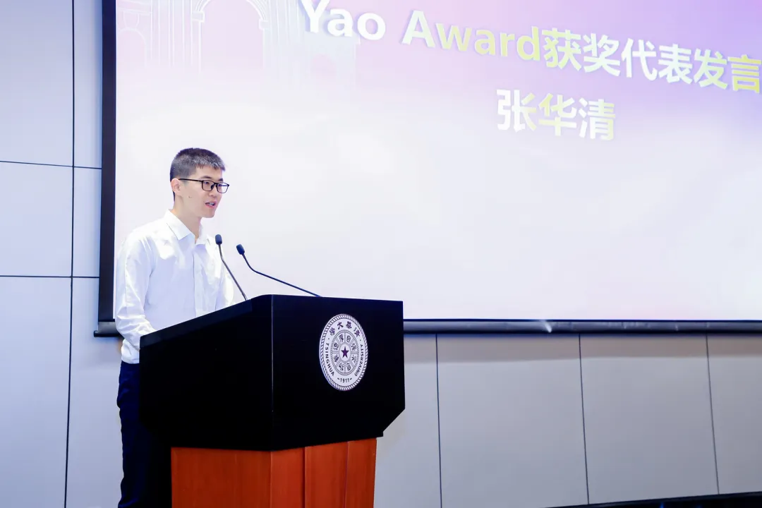 2025年Yao Award金奖获得者张华清代表获奖者发言。他表示,姚班为同学们提供了自由探索的学术沃土,赋予了走向科研“无人区”的勇气。他特别感谢姚先生以深厚的学识和严谨的治学精神为学生开辟成长天地,也感谢老师们在科研引领与人生道路上给予的无私帮助。同时,他深感同学间彼此支持、互相启发的氛围是茶园最珍贵的财富。张华清认为,我们正处在计算机科学与人类发展的黄金时代。面对机遇,他呼吁大家保持独立思考、坚持深入探索,避免因过度依赖技术而弱化自身判断力。最后,他期望与大家一起做时代中奔涌的浪花,共同为人类进步贡献力量。