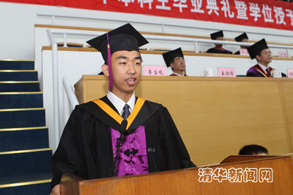 贾志豪同学回顾了在清华“累并快乐着,辛苦并充实着”的学习生活经历,以“舍不得”三个字向辛勤培养自己的母校及师长们表达了深深的谢意和留恋。即将赴美国斯坦福大学攻读博士学位的他与同学们分享了自己在清华体悟到的“做最好的自己”、“真正的热爱值得百分百的专注”,以及“同学是一生的财富”三句话的丰富内涵,表示将坚持梦想,精益求精,追求完美,不断实现自我的超越。